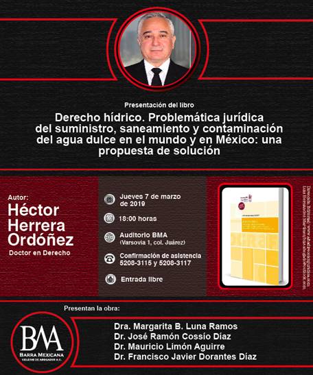 • Marzo 7, 2019. Presentación del libro: “DERECHO HÍDRICO. PROBLEMÁTICA JURÍDICA DEL SUMINISTRO, SANEAMIENTO Y CONTAMINACIÓN DEL AGUA DULCE EN EL MUNDO Y EN MÉXICO: UNA PROPUESTA DE SOLUCIÓN”, a las 18:00 horas en el Auditorio de la Barra Mexicana, Colegio de Abogados, A.C., ubicado en Varsovia No. 1, Col. Juárez, Alcaldía Cuauhtémoc, 06600 Ciudad de México.